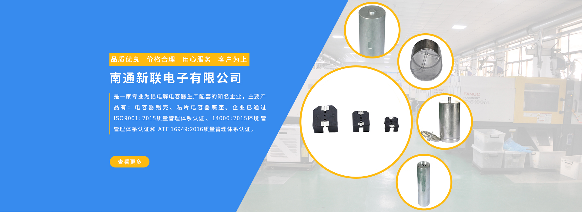 南通新聯(lián)電子有限公司是一家專業(yè)為鋁電解電容器生產(chǎn)配套的知名企業(yè),主要產(chǎn)品有:電容器鋁殼、貼片電容器底座。企業(yè)已通過ISO99001:2015質(zhì)量管理體系認(rèn)證和14000:2015環(huán)境管理體系認(rèn)證。企業(yè)... MORE